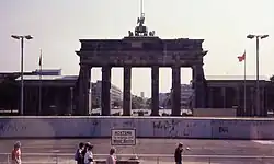 Das Brandenburger Tor in Berlin ist ein frühklassizistisches Triumphtor, das an der Westflanke des quadratischen Pariser Platzes im Berliner Ortsteil Mitte steht. Es wurde als Abschluss der zentralen Prachtstraße der Dorotheenstadt, des Boulevards Unter den Linden, in den Jahren von 1789[1] bis 1793[2] auf Anweisung des preußischen Königs Friedrich Wilhelm II. nach Entwürfen von Carl Gotthard Langhans errichtet. Die das Tor krönende Skulptur der Quadriga ist ein Werk nach dem Entwurf des Bildhauers Johann Gottfried Schadow. Westlich des Brandenburger Tores befinden sich die ausgedehnten Grünflächen des Großen Tiergartens, die in gradliniger Verlängerung der Straße Unter den Linden von der Straße des 17. Juni durchquert werden. Die Platzfläche unmittelbar westlich des Tores trägt den Namen Platz des 18. März.