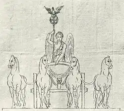 Die Quadriga ist das künstlerische Hauptschmuckwerk des Brandenburger Tores, das bereits von Langhans bei der architektonischen Ausarbeitung vorgesehen wurde. Als Vorbild diente ihm wahrscheinlich das Mausoleum von Halikarnassos – eines der Sieben Weltwunder.[19] Mit dem Einzug der (römischen) Siegesgöttin Victoria im Streitwagen sollte der Einzug des Friedens nach Berlin dargestellt werden. Bereits im ältesten bekannten Besprechungsprotokoll über die Gestaltung der Quadriga vom 13. März 1789 wird die Göttin Victoria namentlich erwähnt: „[Es] wurde beschlossen, daß von Hr. Schadow ein Modell […] zu fertigen sey, welches die Maaße einer Gruppe von 4 Pferde und einem Wagen nebst der Victoria deutlich ausdrückte.“[20] Auch während der Bauphase fand keine Umdeutung der römischen Siegesgöttin statt und der Klempnermeister Koehler erhielt seine Bezahlung ab 1791 „für die kupferne Figur Victoria“.[21] Andere Deutungen als griechische Siegesgöttin Nike oder griechische Friedensgöttin Eirene[22] sind nicht zeitgenössisch belegt und entsprechen nicht dem aktuellen Forschungsstand. Zitha Pöthe schreibt in ihrer 2014 veröffentlichten Dissertation: „Es ist zu untersuchen, warum eine Siegesgöttin die Triumphalquadriga schmückte und nicht eine Friedensgöttin […]. Unwahrscheinlich ist, dass der Wahl eine rein ästhetische Entscheidung zugrunde lag; der prägnante visuelle Unterschied zwischen beiden ist die Darstellung von Schwingen am Rücken der Victoria. Viel mehr wird es ihre Verwendung in der Antike gewesen sein, die Victoria den repräsentativen Platz auf dem Brandenburger Tor sicherte“[23] und „Victoria konnte als Symbol nahtlos in die Bildsprache des Absolutismus eingegliedert werden. Sie diente Friedrich Wilhelm folglich als […] Legitimierung der eigenen Militäraktion im Herbst 1787 und der anschließenden Bündnispolitik, die eine Friedensabsicht verfolgte.“[8] Ebenso finden sich bis zum Ende des 19. Jahrhunderts auch in reputablen Veröffentlichungen Aussagen darüber, dass die Quadriga anfangs andersherum, also mit Blickrichtung nach Charlottenburg, gestanden hätte.[24] Emil von Siefart hat dies 1912 ausführlich widerlegt.[25]