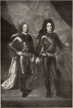 1691 war der in Brandenburg in Ungnade gefallene Feldmarschall Hans Adam von Schöning in kursächsische Dienste getreten und beriet Kurfürst Johann Georg IV. und nach seinem frühen Tod den Nachfolger Friedrich August I., auch bekannt als August der Starke. Schöning gewann einen enormen Einfluss auf beide Kurfürsten und empfahl eine umfangreiche Rüstung und auch einen Krieg gegen die Hohenzollern.[50] 1692 besuchte im Januar zunächst der brandenburgische Kurfürst Friedrich III. den sächsischen Kurfürsten Johann Georg IV. in Torgau, wo der gemeinsame brandenburgisch-sächsische Orden der guten Freundschaft gegründet wurde. Dem folgte im Februar 1692 der Gegenbesuch des sächsischen Kurfürsten in Berlin in Beisein vom Bruder des sächsischen Kurfürsten, Friedrich August I., der dort etliche Proben seiner körperlichen Kraft abgab. Die Reise sollte das durch die Berufung von Schöning in den kursächsischen Dienst gestörte Verhältnis zu Brandenburg wieder glätten.[51] Der Kurbrandenburgische Gesandte Samuel von Chwalkowski berichtete im Dezember 1694 vom hohen Einfluss Schönings am Dresdner Hof nach Berlin. Bis zu Schönings Tod 1696 wurde sein politisches Programm verfolgt.
