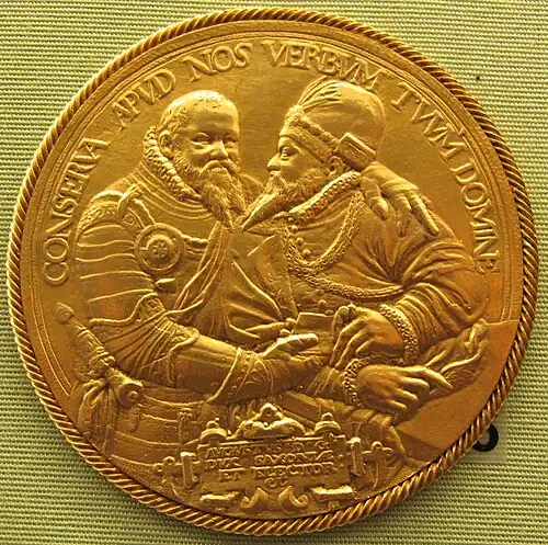 Zunächst war Brandenburg in den Jahren zwischen dem Schmalkaldischen Krieg und dem Fürstenaufstand als die ernestinische und albertinische Linie der Wettiner gegeneinander kämpften aus kaiserlicher Sicht eine wichtige Vermittlerrolle in dieser kaiserfernen Zone des Reiches zugefallen.[13] Nach der Stabilisierung der Position der nun die Kurwürde innehabenden Albertiner geriet Brandenburg in den folgenden Jahrzehnten in die außenpolitische Abhängigkeit der Dresdner Politik. Sachsen war der mächtigere Partner der beiden Länder und Brandenburg repräsentierte den ohnmächtigen Juniorpartner in den Austauschbeziehungen.[14] Die gemeinsamen Interessen Brandenburgs und Sachsens überwogen in der zweiten Hälfte des 16. Jahrhunderts. Regelmäßig verzeichnen die Protokolle des Kurfürstenkollegs für den Hohenzollernschen Vertreter: „stimmt wie Sachsen“. Brandenburg war folglich im 16. Jahrhundert ein verlässlicher Juniorpartner Sachsens.[15] Bei der engen Anlehnung der Hohenzollern an die kursächsische Reichs- und Außenpolitik ist der fast dreißig Jahre regierende Kurfürst Johann Georg zu nennen. Ab 1571 wurde das Verhältnis zwischen August und dem fast gleichaltrigen Johann Georg von einer starken Harmonie geprägt, die bis zu Augusts Tod 1586 anhält. Dieses Verhältnis zeigt auch das Beispiel der im Artikel abgebildeten Goldgussmedaille von Tobias Wolff aus dem 1577 anlässlich der Torgauer Synode 1574. Diese hatte zum Ziel, die radikalen Elemente innerhalb des protestantischen Glaubens auszuschalten. Daraus erwuchs 1577 die Konkordienformel.