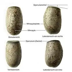 Die vier bis fünf Millimeter langen und zwei bis drei Millimeter breiten Eier werden wie bei allen Obrimini mittels des am Ende des Hinterleibs befindlichen Legestachel in den Boden abgelegt. Ihr Exochorion ist grau und wird bei höherer Luftfeuchtigkeit dunkler und bei Trockenheit wieder heller. Der dorsale Bereich ist bauchig vorgewölbt und der stets dunkelgrau gefärbte Deckel (Operculum) sitzt schräg zur ventralen Seite hin abfallend auf dem Ei, so dass ein Opercularwinkel von etwa 10 Grad entsteht (Siehe auch Bau des Phasmideneies). Die Nymphen schlüpfen nach etwa vier Monaten aus den Eiern und benötigen dann noch einmal vier Monate um heranzuwachsen.[4]