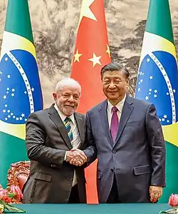 Während der zweiten Präsidentschaft des brasilianischen Präsidenten Luiz Inácio Lula da Silva gehörte die „Wiederbelebung“ der Beziehungen zwischen Brasilien und China zu seinen außenpolitischen Zielen.[5] Lula besuchte China anlässlich eines brasilianisch-chinesischen Gipfeltreffens 2023 und traf mit dem chinesischen Präsidenten Xi Jinping zusammen, wo er zahlreiche bilaterale Abkommen zu einer Vielzahl von Themen unterzeichnete.[6] Er sprach auch seine Unterstützung von Chinas Friedensinitiative in der Ukrainekrise aus. Lula nahm bei seinem viertägigen Besuch auch an der Amtseinführung von Dilma Rousseff als neue Präsidentin der BRICS-Bank in Shanghai teil. Er verkündete „Niemand kann Brasilien daran hindern, seine Beziehungen zu China weiter auszubauen“.[7]