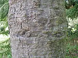 Die bis zu 15 Zentimeter dicke, graubraune Borke des Stammes ist feinschuppig, horizontal gebändert und harzig. Etwa ein Viertel des Schaftvolumens entfällt auf die Borke.