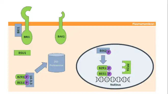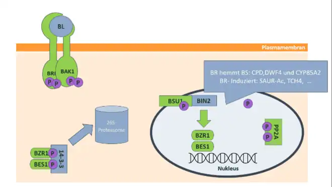 Die Rezeption bei Arabidsopis beginnt am BRI1-Rezeptor (Brassinosteroid Insensitive 1), eine Leucin-reiche-Rezeptor-Kinase, welche extrazellulär die Bindung von Brassinolid ermöglicht. Dadurch ändert sich die Konformation und BRI1 wechselwirkt mit der BRI1-Associated-Rezeptor-Kinase 1 (BAK1). Die Komplexformation führt zur gegenseitigen Phosphorylierung und löst eine intrazelluläre Kaskade an Aktivierungen und Repressionen von Kinasen, Phosphatasen und Transkriptionsfaktoren. So werden die BR Signaling Kinasen (BSK1, BSK2 und BSK3) phosphoryliert und aktiviert, welche die Phosphatase BRI1 Supressor1 (BSU1) aktiviert. Diese kann durch die Hydrolyse eine Phosphatgruppe am Brassinosteroid Insensitive 2 (BIN2) abspalten, welches diese Kinase inhibiert. Dadurch kann das Protein Phosphatase 2A (PP2A) die beiden Transkriptionsfaktoren Brassinazole-Resistant-1 (BZR1) und BRI1-EMS-Supressor-1 (BES1) dephosphorylieren, so dass diese sich im Nukleus akkumulieren und die Expression der Zielgene regulieren. Wenn Brassinolid fehlt, verhindert der Regulator BRI1-Kinase-Inhibitor (BKI1) die Wechselwirkung von dem Rezeptor BRI1 und den Co-Rezeptor BAK1. BIN2 ist nicht Inhibiert, sodass die beiden Transkriptionsfaktoren BZR1 und BES1 phosphoryliert werden und mit der Proteineinheit 14-3-3 interagieren. Sodass BES1 und BZR1 sich im Cytoplasma anreichern und proteasomal durch ein 26S Proteasom abgebaut werden. Somit fungiert die BIN2 Kinase als ein wichtiger negativer Regulator, welches die Aktivität der beiden zentralen Transkriptionsfaktoren BES1 und BZR1 inhibiert.[7]