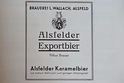 Die Alsfelder Brautradition reicht bis in das Jahr 1414 zurück.[1] Die Ursprünge der heutigen Brauerei Alsfeld AG werden auf das Jahr 1858 zurückgeführt, als der jüdische Unternehmer Meyer Wallach den Braubetrieb von der Bäckerzunft übernahm, nachdem die Stadt ihr Brauhaus und das Braumonopol aufgegeben hatte.[2][3]