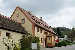 Der Gasthof und die ehemalige Brauerei stehen rechtwinklig um einen Hof. Über dem Portal ist das Wappen der Familie von Oettingen-Spielberg angebracht.