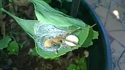 Wie aus einer einmaligen Beobachtung hervorging, legte ein verpaartes Weibchen ein Brutgespinst in einer Größe von etwa fünf Zentimetern an, in dem es etwa zwei Tage später einen weißen, kugeligen Eikokon anfertigte.[12] Bei dem Gespinst handelte es sich um ein sackförmiges Konstrukt mit einem stabilen und kugelförmigen Hohlraum. In diesem Gespinst bewachte das Weibchen seinen Kokon und hielt ihn mithilfe der Cheliceren fest.[10]