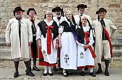„Ein breit angekrempter, schwarzer Hut beschattet das dunkle, strenge Gesicht. […] Jeder trägt ein schwarzes Halstuch, einen tief dunkeln Rock mit rothem Fries gefüttert und mit massiven Bleiknöpfen von oben bis unten besetzt. Nur im heißen Sommer wird über die schwarze Untertracht ein Leinwandkittel gezogen.“