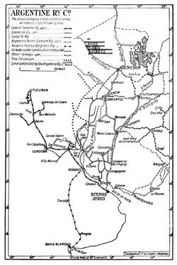 - Über die im Juli 1912 gegründete Tochtergesellschaft Argentine Railway Company, ebenfalls mit Sitz in den USA, Kontrolle über mehr als ein Drittel der argentinischen Bahnen mit rund 13.500 km Länge.[8][9]