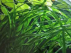 Die untergetauchten Laubblätter sind in einer Rosette angeordnet und fluten im Fließgewässer.[1] Die einfache, dunkel-grüne, zähe und ledrige Blattspreite ist bei einer Länge von bis zu 140 Zentimetern sowie einer Breite von 2 bis 5 Zentimetern bandförmig und kann stark gewellt sein.[1] Die Mittelrippe kann erhaben sein und die Netznervatur ist kaum erkennbar.[1] Der Blattrand ist gezähnt.[1] Stomata fehlen.[1]