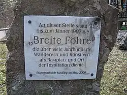 Das Wahrzeichen soll von vielen bekannten Künstlern besucht worden sein, wie etwa Ludwig van Beethoven, Franz Schubert, Hugo Wolf, Arnold Schönberg, Anton von Webern, Moritz von Schwind, Ferdinand Waldmüller, Gustav Klimt, Egon Schiele und Franz Grillparzer.[4] Der deutsche Maler, Radierer und Lithograf Ludwig Ferdinand Schnorr von Carolsfeld fertigte 1838 das Gemälde Die breite Föhre nächst der Brühl bei Mödling an, das sich heute im Belvedere befindet.[5]