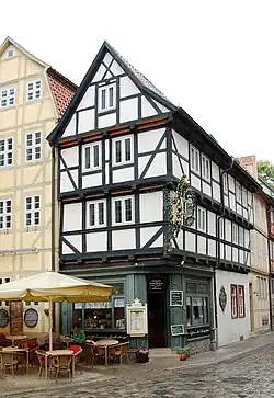 Das dreigeschossige Fachwerkhaus ist traufständig zur Breiten Straße ausgerichtet. Ein markanter schmaler Giebel ist nach Süden ausgerichtet und für die platzartige Erweiterung nordöstlich des Quedlinburger Rathauses prägend. Das Erdgeschoss und das erste Obergeschoss stammen aus der Zeit um 1600. Der Ladeneinbau im Erdgeschoss erfolgte später im Stil des Historismus.