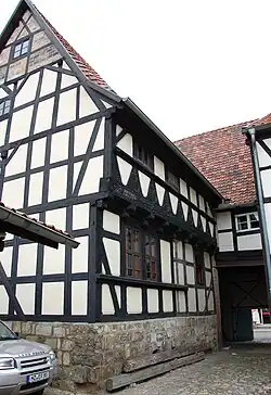 Als ältester Teil des Anwesens besteht hofseitig ein im Jahr 1562, worauf eine Bauinschrift verweist,[1] in Fachwerkbauweise errichteter Gebäudeflügel, der weitgehend in seiner originalen Gestaltung erhalten ist. Die Fachwerkfassade ist üppig verziert. Auf den Fußwinkelhölzern befinden sich Stern-, Fächer- und Sonnenmuster. Darüber hinaus bestehen Schiffskehlen und drei Wellenbänder. Die Stockschwelle ist mit einer gotischen Inschrift versehen.
