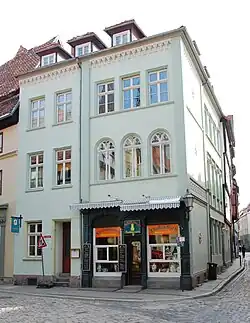 Das Gebäude entstand in der ersten Hälfte des 19. Jahrhunderts als Ersatzneubau für ein Vorgängergebäude. Das Erscheinungsbild des klassizistischen Baus ist durch eine symmetrische Aufteilung der Fassade und ein nur flach geneigtes Dach geprägt. Darüber hinaus bestehen mit Maßwerkfenstern und -friese neogotische Schmuckelemente. Um 1890 entstand im Erdgeschoss eine Ladenfassade im Stil der Neorenaissance.