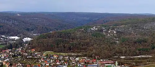 Östlich davon liegt der ehemalige Knörleinsteinbruch, ein Steinbruch mit seltener Schichtung aus Mergelgestein mit Kalksteinlagen aus der Feuerstein-Formation. Der Steinbruch wurde stillgelegt und am 30. Juni 1997 zum geschützten Landschaftsbestandteil Einbühl erklärt. In den im Bereich des Steinbruchs entstandenen Kleinstgewässern kommt die auf der Roten Liste der gefährdeten Arten stehende Gelbbauchunke vor und in den dortigen Wäldern liegen Brutgebiete des Uhus. Auf den Rendzina- und Braunerde-Rendzinaböden kommen neben Gebüschen, Gehölzen sowie mageren Altgrasbeständen auch Orchideenwiesen vor. Im Jahre 2013 kam es wegen widerrechtlicher Eingriffe im Schutzgebiet zu einem öffentlichen Streit.[25] Knapp 400 Meter nordöstlich des Steinbruchs steht die Felsnadel Druidenstein, an der ein Naturlehrpfad vorbeiführt.