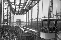 Die Bremen wurde am 18. Juni 1927 auf der Deschimag-Werft AG Weser in Bremen auf Kiel gelegt. Am 16. August 1928 taufte Reichspräsident Paul von Hindenburg das Schiff beim Stapellauf auf den Namen Bremen. Die Innenausstattung wurde von namhaften Architekten entworfen, zu großen Teilen von F.A. Breuhaus, Bruno Paul, dem Bremer Carl Rotermund und dem Düsseldorfer Architekten Karl Wach. R.A. Schröder entwarf die Architektur des Rauchsalons.[2] Am 12. Juni 1929 begannen die Probefahrten und schon auf der Probefahrt am 27. Juni 1929 erreichte die Bremen eine maximale Geschwindigkeit von 28,8 Knoten. Nach Abschluss der Probefahrten übergab die Werft das Schiff am 5. Juli 1929 an den Norddeutschen Lloyd (NDL). Es startete am 16. Juli 1929 zu seiner Jungfernfahrt von Bremerhaven nach New York.[3] Insgesamt kostete der Bau der Bremen ca. 65 Mio. Reichsmark.