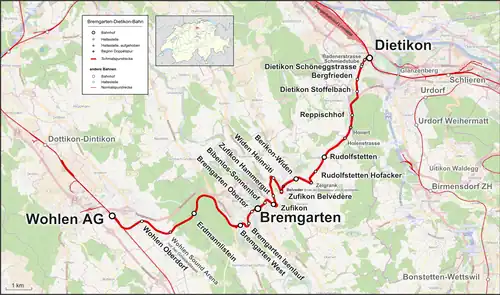 | Streckennummer (BAV): | 655 (Wohlen Süd–Bremgarten West) 656 (Bremgarten West–Dietikon) | ||||||||||||||||||||||||||||||||||||||||||||||||||||||||||||||||||||||||||||||||||||||||||||||||||||||||||||||||||||||||||||||||||||||||||||||||||||