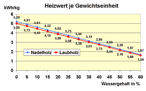Sehr trockenes Laubholz hat einen Heizwert von etwa 5 kWh/kg. Nadelholz hat einen Heizwert von etwa 5,2 kWh/kg, weil es mehr Harz enthält als Laubholz.
