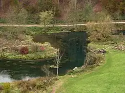 - Pfeffer, von links und Nordnordosten auf 496,7 m ü. NHN[LUBW 8] am Kloster Königsbronn, 0,5 km und 0,1 km². Entspringt auf etwa 510 m ü. NHN unterm Herrenstein und hinter dem Königsbronner Gießereiwerk einer angestauten Karstquelle.