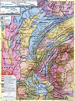 - Die Auffaltung der Alpen brachte starken Druck von Südosten, was zur Auffaltung des Juragebirges während des Oligozän und Miozän führte. Das Zentralmassiv wiederum widerstand dem Druck der Alpenfaltung und es entstand die Senke des Saônegrabens, in dem sich Seen oder ein See bildete, der sogenannte Bressesee (Lac Bressan). Rhein und Loire ergossen sich in diesen See, der wiederum durch einen Abfluss nach Südosten entwässert wurde. Es wird angenommen, dass der See nur eine geringe Tiefe hatte und durch Landzungen unterbrochen war und deshalb kaum eine einheitliche, geschlossene Wasseroberfläche aufwies, sondern eher einer Seenplatte glich.