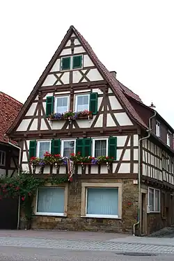 Das lange Zeit als Wohn- und Geschäftshaus genutzte Gebäude steht mit dem Westgiebel zur Straße und befindet sich gegenüber dem Amthof. Über dem massiven Erdgeschoss erhebt sich ein Fachwerkstock und zwei Dachstöcke, die überkragen. Die Fenster wurden in neuerer Zeit vergrößert und der untere Dachstock wurde zur Wohnung ausgebaut. Als Zierformen sehen wir den Fränkischen Mann und Andreaskreuze. Die Konsolen mit Wülsten und Kehlen sind typisch für das 16. Jahrhundert.