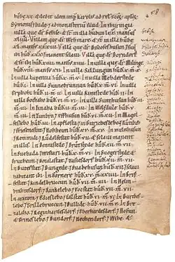 Die Summe der Hufen und Mansen ist aber sowohl in den Tafeln, als auch am Ende fehlerhaft. Die Ursache dafür könnte an den Nachträgen liegen, die am Ende des 9. Jahrhunderts getätigt wurden. Was man damals genau unter den Maßen Hufe und Manse verstand bzw. worin der Unterschied bestand, ist nicht eindeutig belegbar.[1] Weiterhin ist der Begriff „villa“ im Lateinischen mehrdeutig. Es kann hier sowohl der grundherrliche Hof, als auch ein bäuerliches Dorf gemeint sein.[2]
