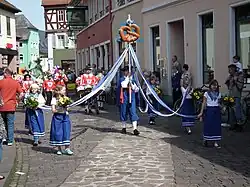 Sommertagszug mit Brezelbub und Blumenkindern am Bänderbaum im badischen Ladenburg