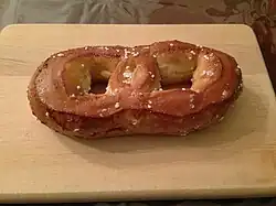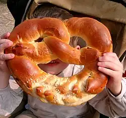 Die Brezel (in Bayern und Österreich die Breze) ist ein salziges oder selten auch süßes Gebäck in der Form eines symmetrisch verschlungenen Teigstrangs. Ihre Anfänge liegen im Mittelalter des deutschsprachigen Raums (Deutschland, Elsass, Österreich, Schweiz und Südtirol). Der Name Brezel wird von der etymologischen Forschung vom lateinischen brachium abgeleitet („der Arm“; mutmaßlich bezogen auf das Verschränken beider Unterarme vor dem Brustkorb).[1] Die Brezel ist das am weitesten verbreitete Gebildbrot oder Bildergebäck. Seit dem Mittelalter wird die Brezel von der Bäcker-Zunft als Zunftzeichen und heute als Wahrzeichen von den Bäcker-Innungen sowie den Bäckereien verwendet.[2] Im Laufe der Jahrhunderte bildeten sich zunehmend mehr Varianten der Brezel in immer mehr Regionen und Ländern aus. Am meisten verbreitet sind die bayerische Brezn[3] mit weitgehend gleicher Dicke und die schwäbische Brezel mit einem dicken Bauch und zwei dünnen Armen.