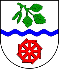 Blasonierung: „In Silber ein blauer Wellenbalken, begleitet oben von einem grünen Birkenzweig, unten von einem achtspeichigen roten Wasserrad.“[5]