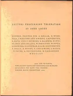 - Letter concerning Toleration. London 1689. (Englische Übersetzung von W. Popple)