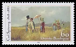 - Bild: Eine bearbeitete Abbildung der genannten Marke. Das Verhältnis der Größe der Briefmarken zueinander ist in diesem Artikel annähernd maßstabsgerecht dargestellt. Sollten keine Marken abgebildet sein, liegt es daran, dass das Urheberrecht des Künstlers noch nicht erloschen ist.