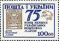 75. Jahrestag der ersten ukrainischen Briefmarken. Tag der Briefmarke | 100 Karbowanez |
