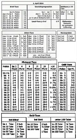 • 1814 19. März (Gesetzsammlung S. 295) Verordnung, in Betreff der vom 1. April d. J. an, einzuführenden Post-Taxe.