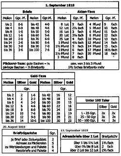 Briefe: Ein einfacher Brief ist ein solcher, welcher nicht voll 1 Lot wiegt. Briefe über 4 Lot werden nur auf Wunsch mit der Briefpost befördert. Briefe über 16 Lot werden in jedem Falle mit der Fahrpost befördert. Für Postsendungen, welche durch Briefsammlungen besorgt werden, ist bis zum nächsten Postort für einen einfachen Brief ½ Gr., für einen schwereren Brief oder ein Paket, ohne Rücksicht auf Wertangabe 1 Gr. zu zahlen. Für Sendungen darüber hinaus ist nur das taxmäßige Porto von diesem Postort ab zu entrichten.