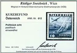 - ↑ Geschäftsordnung für Prüfaufträge (VP-Prüfordnung). Stand: 24.4.2018. Verband Philatelistischer Prüfer, 24. April 2018, abgerufen am 25. November 2018 (anders als in älteren Versionen der Prüfordnung sollen Fälschungen als „falsch“ gekennzeichnet werden): „5.6 Falsche oder verfälschte Prüfobjekte sollen vom Verbandsprüfer gut sichtbar und untilgbar gekennzeichnet werden; […]“