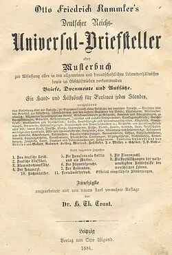 - Otto Friedrich Rammler: Otto Friedrich Rammler's Universal-Briefsteller oder Musterbuch zur Abfassung aller in den allgemeinen und freundschaftlichen Lebensverhältnissen sowie im Geschäftsleben vorkommenden Briefe, Documente und Aufsätze. 18. Auflage. Otto Wigand, Leipzig 1848, OCLC 162480667, urn:nbn:de:bvb:12-bsb10403732-6.