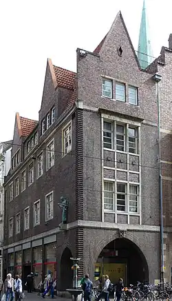 Eine expressionistische Bronzefigur eines Goldschmieds über dem schmalen spitzbogigen Arkadendurchgang an der Sögestraße stammt von dem Bildhauer Engelhard Tölken (1882–1928).