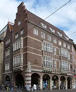 Das dreigeschossige, verklinkerte Haus mit den zwei Zwerchgiebeln stammt von 1928. Es wurde nach Plänen von Behrens und Neumark für das alteingesessene Juweliergeschäft Brinckmann und Lange in bester städtischer Lage gebaut. Über dem großen Arkadenbogen im Erdgeschoss steht eine schmale hohe Giebelfront mit vereinfachtem Staffelgiebel und angedeuteten, zweigeschossigem Erkervorbau.