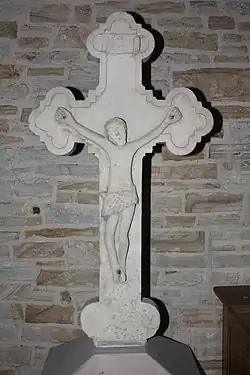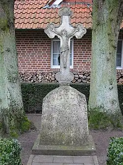 Flankiert von zwei Linden steht auf einem Sockel ein Sandsteinkreuz mit einer Gesamthöhe von 2,20 m. Das Kruzifix, das durch eine Stützstange gesichert ist, ist 1,20 m hoch und 66 cm breit. Der Form nach ist es ein sogenanntes Lazaruskreuz.