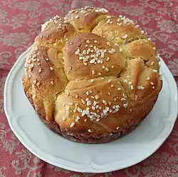 Die Brioche [] (Plural: Brioches; deutsch gelegentlich Apostelkuchen[1]) ist ein lockeres und eierreiches Frühstücks- und Kaffeegebäck, das ursprünglich aus Frankreich stammt. In Österreich bezeichnet Brioche ein Weißgebäck mit unterschiedlichen Größen und Formen, das mit Ei bestrichen und mit Hagelzucker bestreut wird.[2]