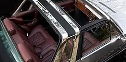 Ein besonderes Merkmal des Bristol 412 war ein kleines Seitenfenster, das in den Überrollbügel eingelassen war und jedenfalls bei den frühen Modellen geöffnet werden konnte. Nahezu alle Exemplare hatten ein solches Fenster; bei mindestens einem Fahrzeug allerdings war der Überrollbügel stattdessen vollständig mit Vinyl überzogen.[6] Zwischen Windschutzscheibenrahmen und Überrollbügel befand sich ein Targadach aus Kunststoff, das entfernbar war, über den Rücksitzen dagegen ein herabklappbares Stoffverdeck, das dem früheren Landau-Stil entsprach.