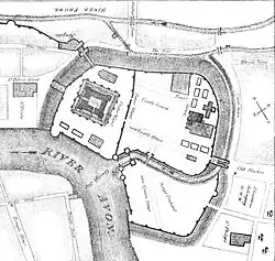 Der Burggraben wurde 1847 abgedeckt,[14] existiert aber heute noch und ist größtenteils schiffbar. Er befindet sich unter dem Castle Park und ergießt sich in den Floating Harbour. Der westliche Teil des Grabens ist trocken. Ein Ausfalltor in den Graben bei der Peterskirche ist bis heute erhalten.