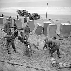 Wo eine Panzersperre erforderlich war, wurden Landungshindernisse, „Admiralty scaffolding“ (auch bekannt als Hindernis Z.1) errichtet. Im Wesentlichen handelte es sich dabei um einen Zaun aus Gerüstrohren, der 2,7 m hoch war und bei Niedrigwasser aufgestellt wurde. Panzer konnten diese Hindernisse nicht durch einfaches Niederwalzen überwinden.[55] Hunderte von Kilometern gefährdeter Strände wurden auf diese Weise gesichert.[56]