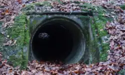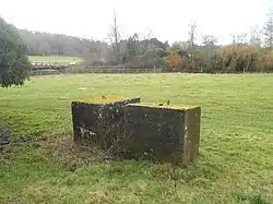 Ein anderes entfernbares Straßensperrsystem verwendete Minen. Die erhaltenen Überreste solcher Systeme ähneln oberflächlich denen von „Igel“ oder „Haarnadel“, aber die Gruben sind flach: gerade tief genug, um eine Panzerabwehrmine aufzunehmen. Wenn sie nicht in Gebrauch waren, wurden die Gruben mit Holzpfropfen gefüllt, so dass der Verkehr normal passieren konnte.[71]
