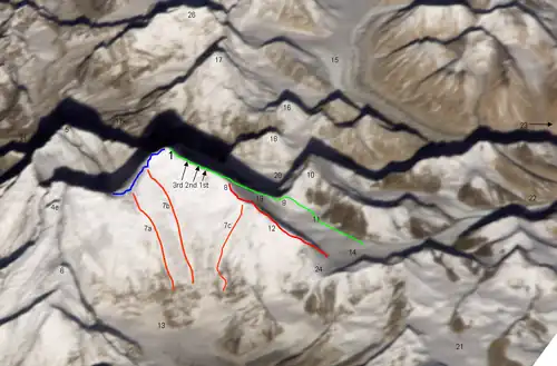 Mallory hatte im Jahr 1921 vom Lhakpa La aus eine gangbare Route zur Nordseite des Berges und weiter zum Gipfel entdeckt.[11] Diese Route beginnt am Rongpu-Gletscher und verläuft dann über den einmündenden Östlichen Rongpu-Gletscher zunächst zum Nordsattel. Von dort aus ermöglichen die ausgesetzten Gipfelgrate (Nordgrat und Nordostgrat) den weiteren Aufstieg. Ein ernsthaftes, kräftezehrendes und klettertechnisch schwieriges Hindernis ist die zweite Felsstufe im Nordostgrat, der Second Step in etwa 8610 m Höhe, deren Schwierigkeit vor der Expedition aber noch unbekannt war. Vielmehr wurde der Berg oberhalb des Nordsattels als einfacher Felsberg angesehen. Der Second Step hat eine Kletterhöhe von etwa 40 Metern, die letzten fünf Meter sind fast senkrecht. Von dort führt die zumeist auf dem Grat verlaufende Route noch recht weit und auch über das bis zu 50 Grad steile Gipfelschneefeld. Erstmals gelang chinesischen Bergsteigern im Jahr 1960 die Bewältigung dieser Route. Abweichend zu dieser späteren Erstbegehung erwogen die Briten, oberhalb des Nordsattels in die Nordflanke des Berges zu queren und über eine steile Schlucht, die später Norton-Couloir genannt wurde, den Gipfel zu ersteigen. Über diese Route erreichte erst Reinhold Messner im Jahr 1980 den Gipfel.[15]