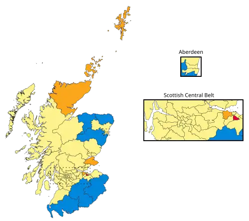 Ein weiteres Kennzeichen der Wahl waren die deutlichen Gewinne der Scottish National Party. Die SNP hatte bei der Wahl 2017 im Vergleich zu 2015 erhebliche Verluste hinnehmen müssen, die sie dieses Mal wieder zu einem großen Teil aufholen konnte. Sie gewann 48 der 59 Wahlkreise Schottlands, darunter auch mit sehr knapper Mehrheit von 149 Stimmen den Wahlkreis East Dunbartonshire der LibDems-Vorsitzenden Jo Swinson.[31] Noch am Wahlabend kündigte die Erste Ministerin Nicola Sturgeon an, dass sie sich um ein zweites Unabhängigkeitsreferendum in Schottland (indyref2) bemühen werde.[32] Diese Forderung wurde von den Konservativen und Boris Johnson kategorisch abgelehnt.