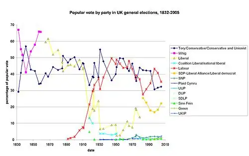 Das britische Parlament wird im Mehrheitswahlverfahren gewählt (engl. first past the post). Erreicht eine Partei die absolute Mehrheit der Sitze, bildet sie die neue Regierung und der Parteivorsitzende wird Premierminister. In den seltenen Fällen ohne klare Mehrheitsverhältnisse (siehe Hung parliament) bilden zwei oder mehr Parteien eine Koalition, wobei der Anführer der größten Koalitionspartei Premierminister wird. Alternativ kann eine Partei auch eine Minderheitsregierung bilden, die sich auf informelle Absprachen mit anderen Parteien stützt.