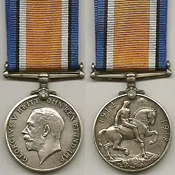 Die British War Medal ist eine britische Auszeichnung für Offiziere sowie Männer und Frauen der britischen und kaiserlichen Streitkräfte für Dienste im Ersten Weltkrieg verliehen wurde. Sie wurde am 26. Juli 1919 durch König George V. eingeführt.