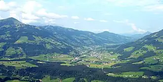 ![]() Das Brixental Richtung Osten mit Westendorf (vorne) und Brixen im Thale | ||