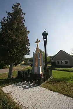 - Steinernes Kreuz und Dorfglocke auf dem Dorfplatz
